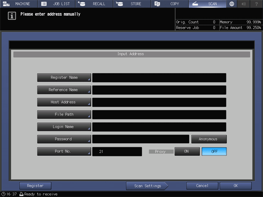 Touch panel - [SCAN] - [FTP] - [Input Address]
