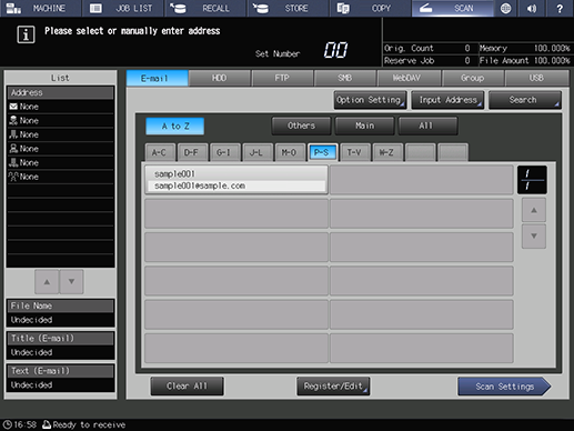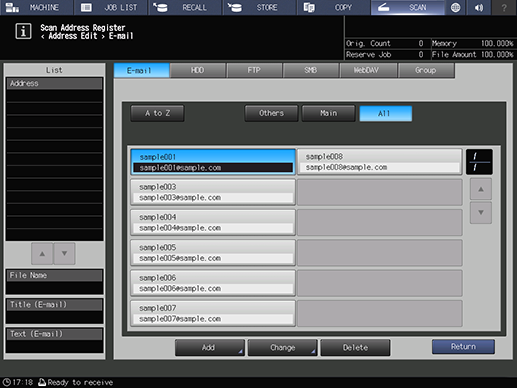 Control panel - Utility/Counter - [Scan Address Register] - [Address Edit] - [HDD] - Select an address. - [Delete] | |||