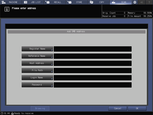 Touch panel - [SCAN] - [SMB] - [Register/Edit] - [Add]