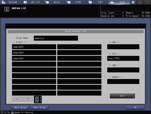 Touch panel - [SCAN] - [Group] - Select a group destination. - [List]