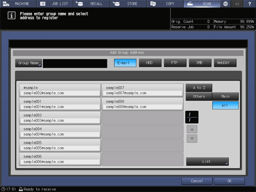 Touch panel - [SCAN] - [Group] - [Register/Edit] - [Add]