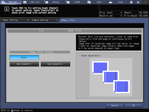 Touch panel - [MACHINE] - [Paper Setting] - [Adjustment] - [Image Jitter]