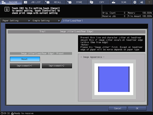 Touch Panel - [MACHINE] - [Paper Setting] - [Adjustment] - [Image Jitter(Lead/Rear Edge)]
