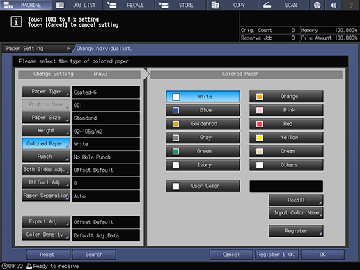 Touch panel - [MACHINE] - [Paper Setting] - [Change Set] - [Colored Paper]