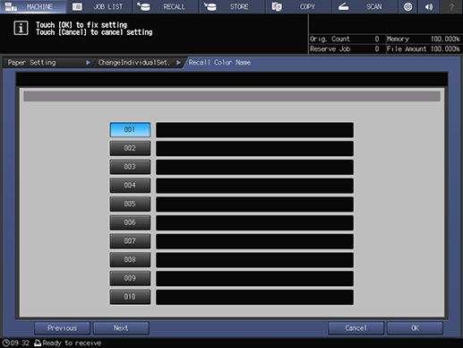 Touch panel - [MACHINE] - [Paper Setting] - [New Setting] - [Colored Paper] - [Register] | |||