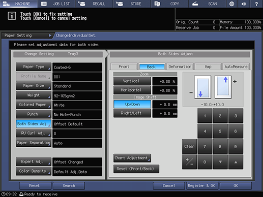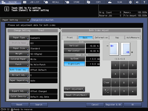 Touch panel - [MACHINE] - [Paper Setting] - [Change Set] - [Both Sides Adj.] - [Back] | ||||