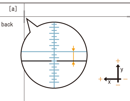 When the scale of [a] is misaligned with the front side by 1.5 mm on the plus side of the Y-axis, as shown in the figure in step 3, enter 15 and press [+ / -] to move the blue line on the back side by 1.5 mm in the minus direction.
