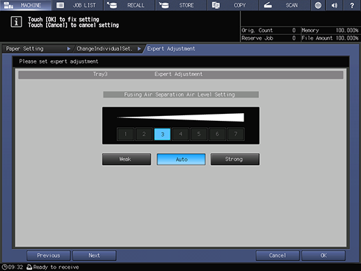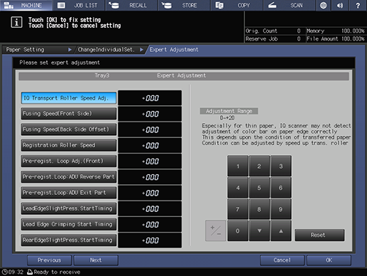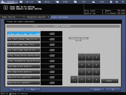 Touch panel - [MACHINE] - [Paper Setting] - [Change Set] - [Expert Adj.]