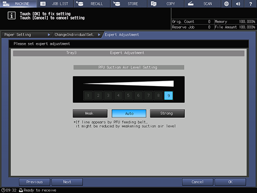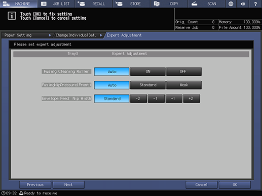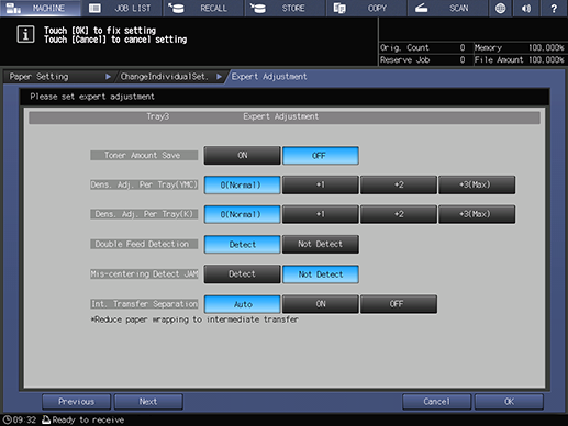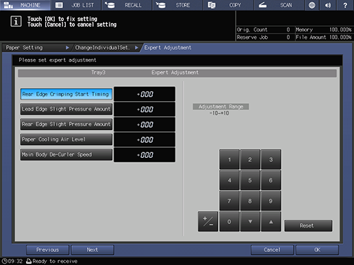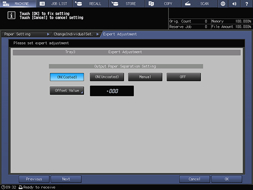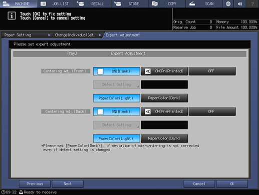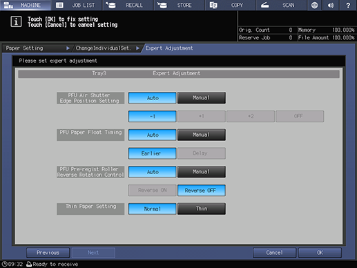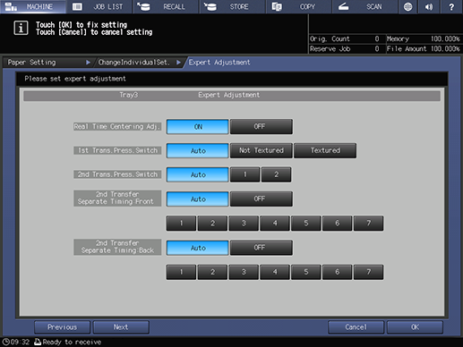 Touch panel - [MACHINE] - [Paper Setting] - [New Setting] - [Expert Adj.]