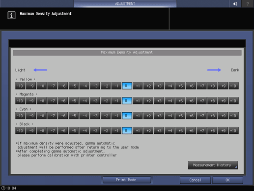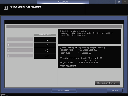 Touch panel - [MACHINE] - [Adjustment] - [Quality Adjustment] - [Package Color Manual Adj.] - [Max Density Adjustment]