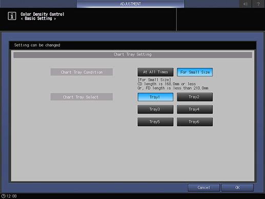To output the [Color Density Control] chart from the paper tray selected in [Chart Tray Select] only when the job printing paper is a small size (width: 168.0 mm / 6.614" or less, or length: 210.0 mm / 8.27" or less), select [For Small Size].