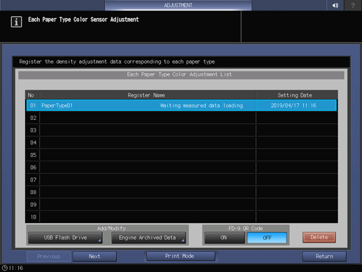 Touch panel - [MACHINE] - [Adjustment] - [Quality Adjustment] - [Color Density Control] - [Each Paper Type Color Adj.]