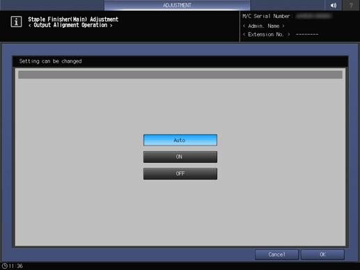 Touch panel - [MACHINE] - [Adjustment] - [Finisher Adjustment] - [Staple Finisher Adjustment] - [Staple Finisher(Main) Adj.] - [Output Alignment Operation]