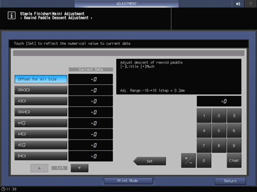 Control panel - Utility/Counter - [Administrator Setting] - [System Setting] - [Expert Adjustment] - [Finisher Adjustment] - [Staple Finisher Adjustment] - [Staple Finisher(Main) Adj.] - [Rewind Paddle Descent Adj.] | |||