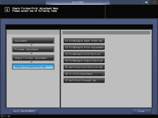 Touch panel - [MACHINE] - [Adjustment] - [Finisher Adjustment] - [Staple Finisher Adjustment] - [Staple Finisher(Fold) Adj.]