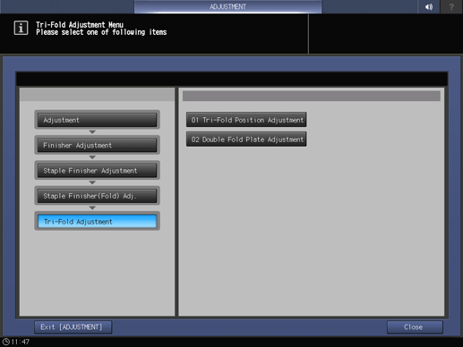 Touch panel - [MACHINE] - [Adjustment] - [Finisher Adjustment] - [Staple Finisher Adjustment] - [Staple Finisher(Fold) Adj.] - [Tri-Fold Adjustment]