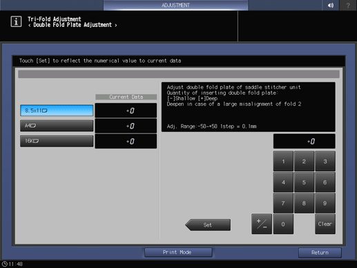 Screen access | Touch panel - [MACHINE] - [Adjustment] - [Finisher Adjustment] - [Staple Finisher Adjustment] - [Staple Finisher(Fold) Adj.] - [Tri-Fold Adjustment] - [Double Fold Plate Adjustment] | ||