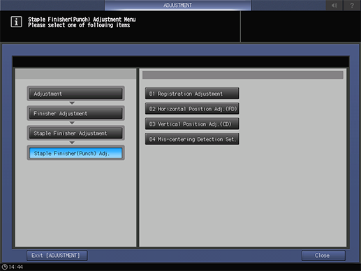 Touch panel - [MACHINE] - [Adjustment] - [Finisher Adjustment] - [Staple Finisher Adjustment] - [Staple Finisher(Punch) Adj.]