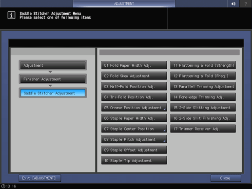 Touch panel - [MACHINE] - [Adjustment] - [Finisher Adjustment] - [Saddle Stitcher Adjustment]