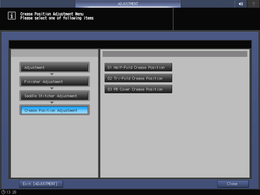 Control panel - [Adjustment] - [Finisher Adjustment] - [Saddle Stitcher Adjustment] - [Crease Position Adjustment]