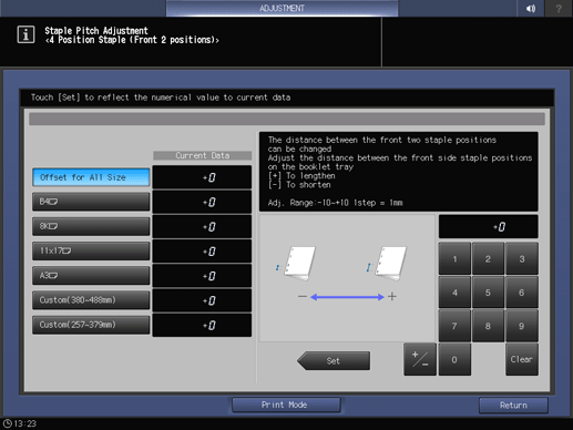 Screen access | Touch panel - [MACHINE] - [Adjustment] - [Finisher Adjustment] - [Saddle Stitcher Adjustment] - [Staple Pitch Adjustment] - [4 Position Staple(Front 2)] | ||