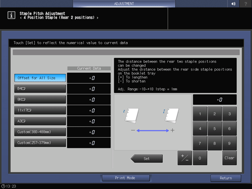 Screen access | Touch panel - [MACHINE] - [Adjustment] - [Finisher Adjustment] - [Saddle Stitcher Adjustment] - [Staple Pitch Adjustment] - [4 Position Staple(Rear 2)] | ||
