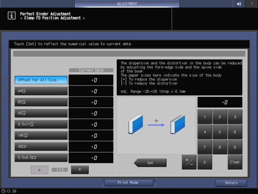 Control panel - Utility/Counter - [Administrator Setting] - [System Setting] - [Expert Adjustment] - [Finisher Adjustment] - [Perfect Binder Adjustment] - [Clamp FD Position Adj.] | |||