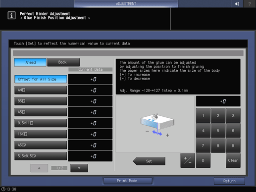 Control panel - Utility/Counter - [Administrator Setting] - [System Setting] - [Expert Adjustment] - [Finisher Adjustment] - [Perfect Binder Adjustment] - [Glue Finish Position] | |||