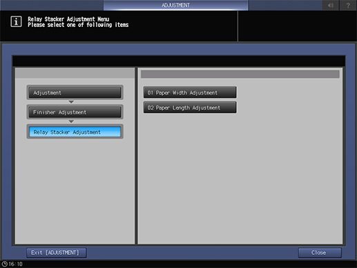 Touch panel - [MACHINE] - [Adjustment] - [Finisher Adjustment] - [Relay Stacker Adjustment]