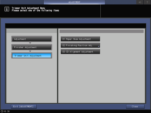 Touch panel - [MACHINE] - [Adjustment] - [Finisher Adjustment] - [Trimmer Unit Adjustment]