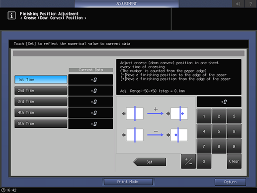 Screen access | Touch panel - [MACHINE] - [Adjustment] - [Finisher Adjustment] - [Trimmer Unit Adjustment] - [Finishing Position Adj.] - [Crease(Down Convex) Position] | ||