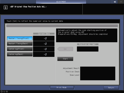 Screen access | Touch panel - [MACHINE] - [Adjustment] - [ADF Adjustment] - [ADF Orig. Stop Pos. Auto] | ||