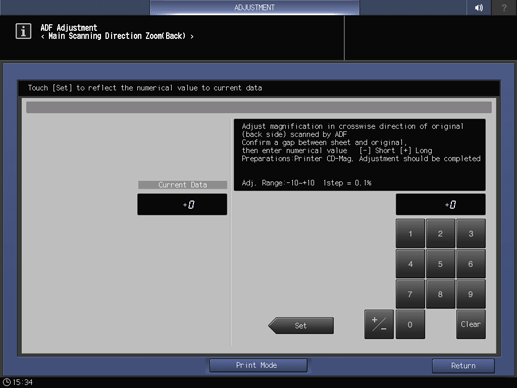 Screen access | Touch panel - [MACHINE] - [Adjustment] - [ADF Adjustment] - [Main Scan Dir. Zoom(Back)] | ||