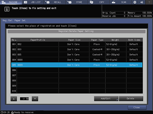 Paper profiles registered with [ChangeIndividualSet.] of [Paper Setting] can also be edited.