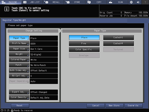 If you pushed [New Store] in step 3, the [Profile Name] screen is displayed. Edit the paper profile name and press [OK] to register the new paper profile in the unregistered line with the small No. This is useful when you want to create paper profiles of a similar type.