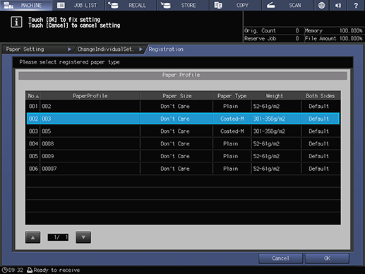 Touch panel - [MACHINE] - [Paper Setting] - [Register] - [Paper Type] | |||