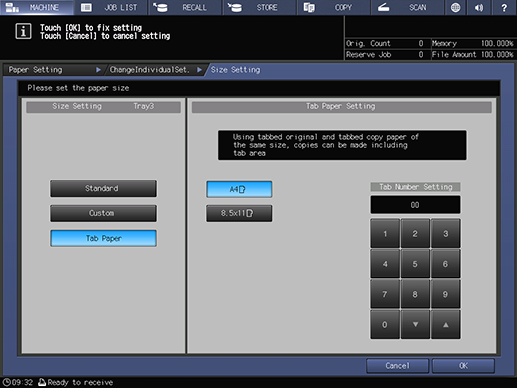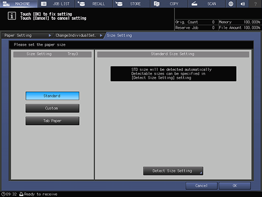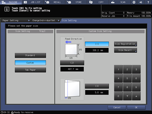 Touch panel - [MACHINE] - [Paper Setting] - [Change Set] - [Paper Size]