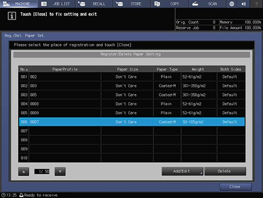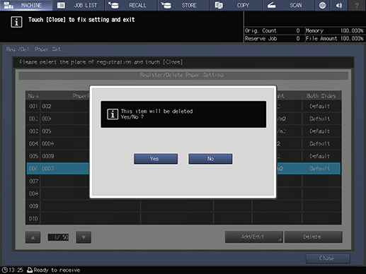 Screen access | Touch panel - [MACHINE] - [Reg./Del.PaperSet.] - [Delete] | ||
