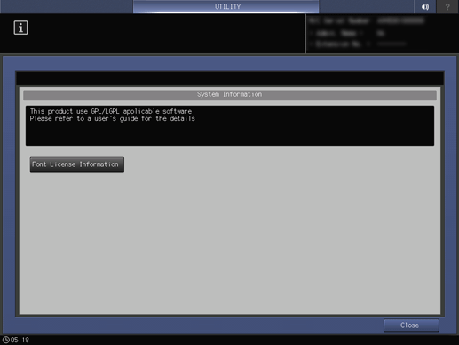 This function allows you to confirm license information of the font that is displayed on the Touch panel of this system.