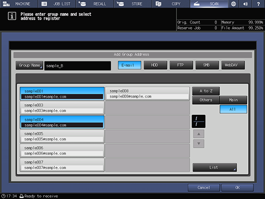 Control panel - Utility/Counter - [Administrator Setting] - [Scan Address Register] - [Address Edit] - [Group] - [Add] | |||