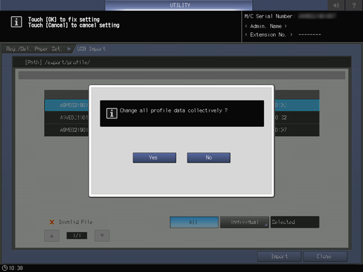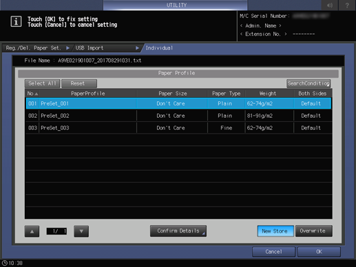 [Individual] | Selects the paper profile you want to import from the paper profiles stored on the USB flash drive, and imports it to this system. Selecting New Store allows you to import up to 500 paper profiles together with the number of data items registered to this system (the number of paper profiles that can be imported is calculated by subtracting the number of registered paper profiles from 500). Selecting Overwrite allows you to import up to 500 paper profiles. | ||