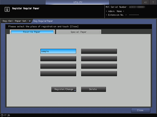 Screen access | Control panel - Utility/Counter - [User Setting] - [System Setting] - [Paper Tray Setting] - [Paper Setting] - [Paper Profile Setting] - Select a paper profile. - [Reg.RegularPaper] - [Favorite Paper] | ||