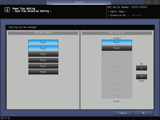 Control panel - Utility/Counter - [User Setting] - [System Setting] - [Paper Tray Setting] - [Auto Tray Selection Setting]