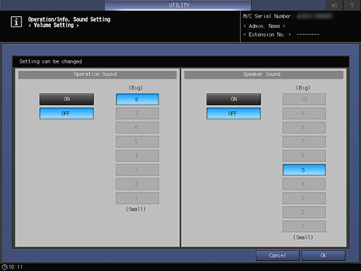Control panel - Utility/Counter - [User Setting] - [System Setting] - [Operation/Info.Sound Setting] - [Volume Setting]