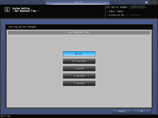 Screen access | Control panel - Utility/Counter - [User Setting] - [System Setting] - [Key Response Time] | ||