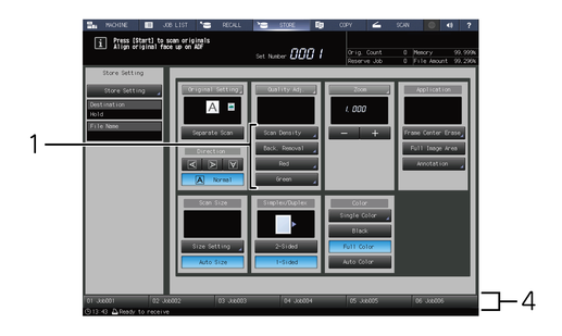 No. | Screen and item | [COPY] screen | [SCAN] screen - [Scan Settings] screen | [STORE] screen |