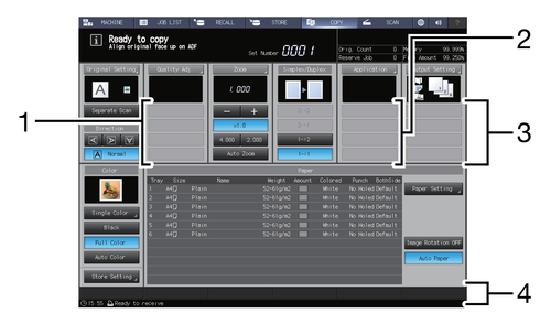 2 | [Application] | Up to four items can be set. For details, refer to [Application(Copy)]. | Up to two items can be set. For details, refer to [Application(Scan)]. | - |