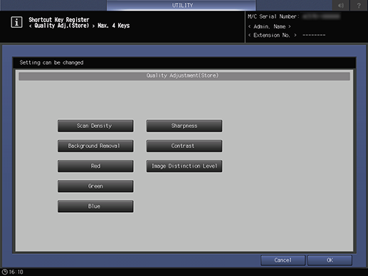 Screen access | Control panel - Utility/Counter - [User Setting] - [System Setting] - [Shortcut Key Register] - [Quality Adj.(Store)] | ||