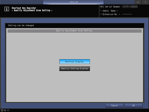 Screen access | Control panel - Utility/Counter - [User Setting] - [System Setting] - [Shortcut Key Register] - [Quality Adj. Area Setting] | ||