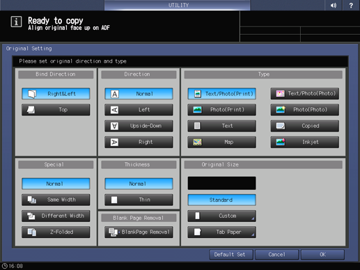 Control panel - Utility/Counter - [User Setting] - [Initial Setting] - [Copy Initial Setting] - [Original Setting]